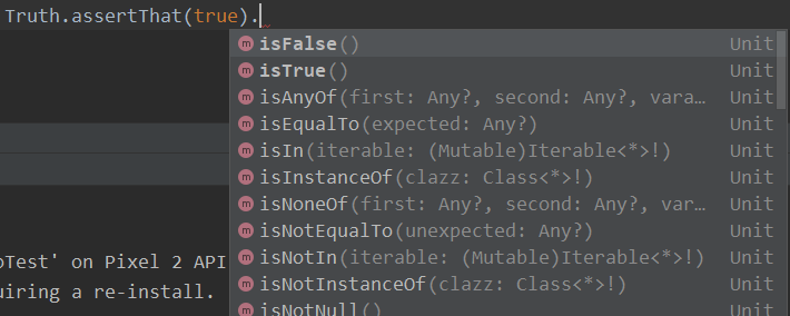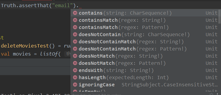 Note that depending on Truth's assertThat() parameter, a different testing function will result. I just added